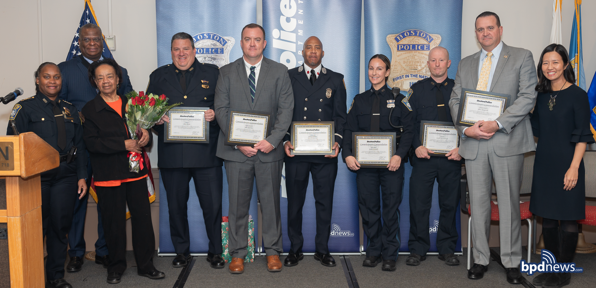 The Boston Police Department honored the bravery of some of its own today in a ceremony celebrating community policing and service to the residents of our City. The Commendation Ceremony took place at 11:00 AM, on Friday, December 8, 2023, at Florian Hall in Dorchester. The ceremony honored officers, detectives, Quincy police, Boston Fire Department, and Civilian Personnel. Commissioner Cox, Mayor Wu, members of the Command Staff, and Community Partners all joined together to present these awards. The commendations involved multiple incidents involving the apprehension of violent suspects, life saving tactics, data tracking, and youth connect programs. We would like to extend our gratitude to officers saving the life of a well-known community member, Miss Myrtle, also known as the Charlie Charlie 2. Officers were speaking with Miss Myrtle at a meeting when they observed her sit in a chair and suffer a medical emergency. Officers and a BFD Lieutenant acted quickly to administer life saving measures. These actions by our officers are an example of the amazing work the men and women of the Boston Police Department do on a daily basis. We congratulate all who were honored and thank you for your service!