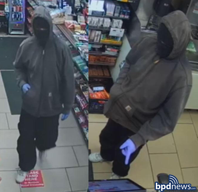 BPD Community Alert: Detectives assigned to District A-1 (Downtown) are seeking the public’s assistance to identify the pictured individual involved in an armed robbery incident that occurred at about 6:30 PM on Sunday, February 11, 2023, in the area of 74 Staniford Street. The suspect was described as a black male, wearing a black mask, gray Carhart jacket, black pants, white and black sneakers, and purple surgical gloves.