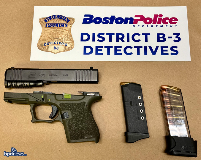 Detectives assigned to District B-3 (Mattapan) executed a search warrant in the area of 4 Olde Derby Road, Norwood. As a result of the search warrant, detectives recovered a firearm with a Glock 43X upper and a Polymer 80 lower, with two fully loaded magazines. Detectives will seek additional firearm charges.
