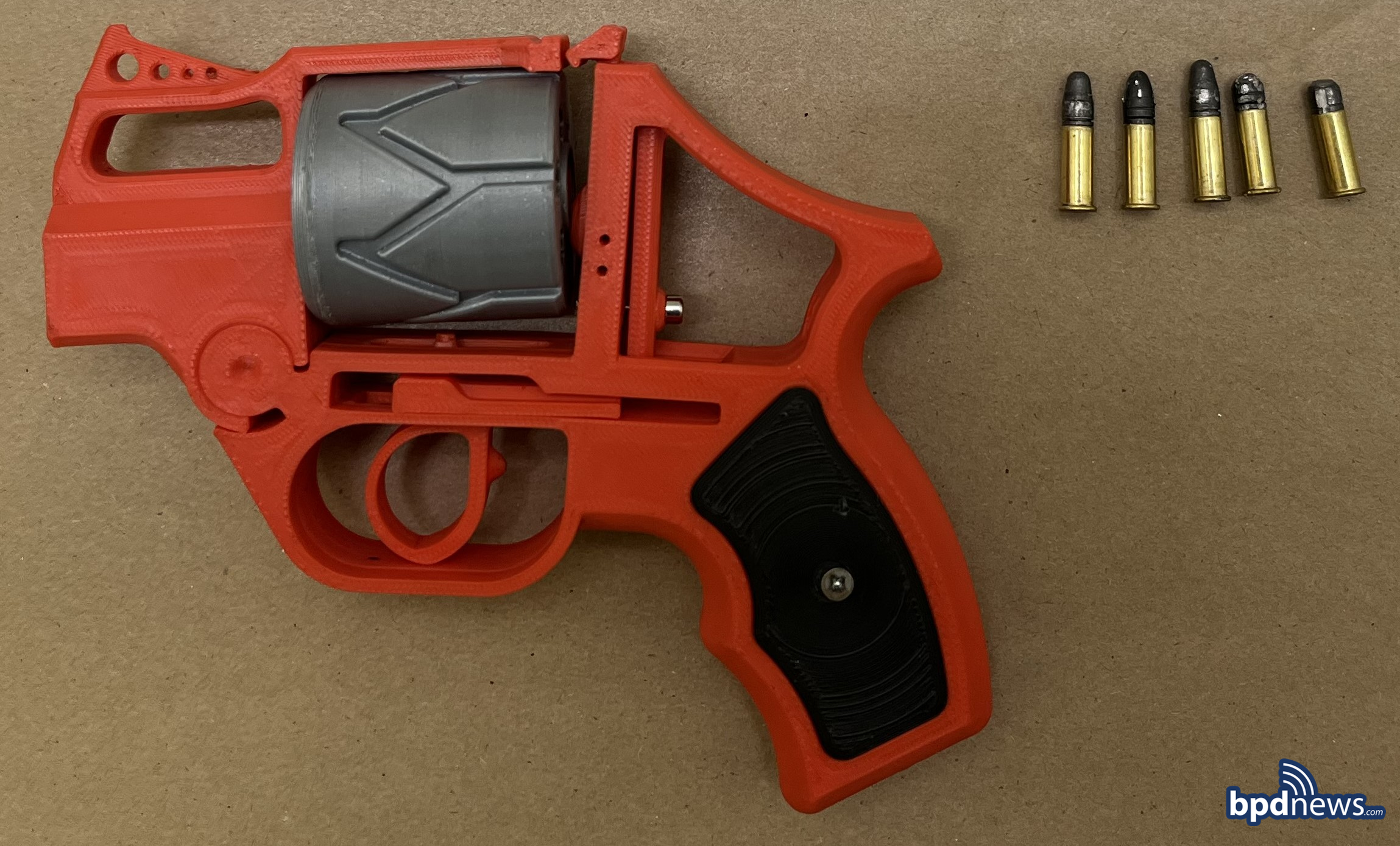 B-3 Detectives were requested to respond to the scene and assist with processing the evidence. One of the firearms was determined to be a replica firearm, while the second firearm was an Orange 3-D printed gun loaded with five rounds.