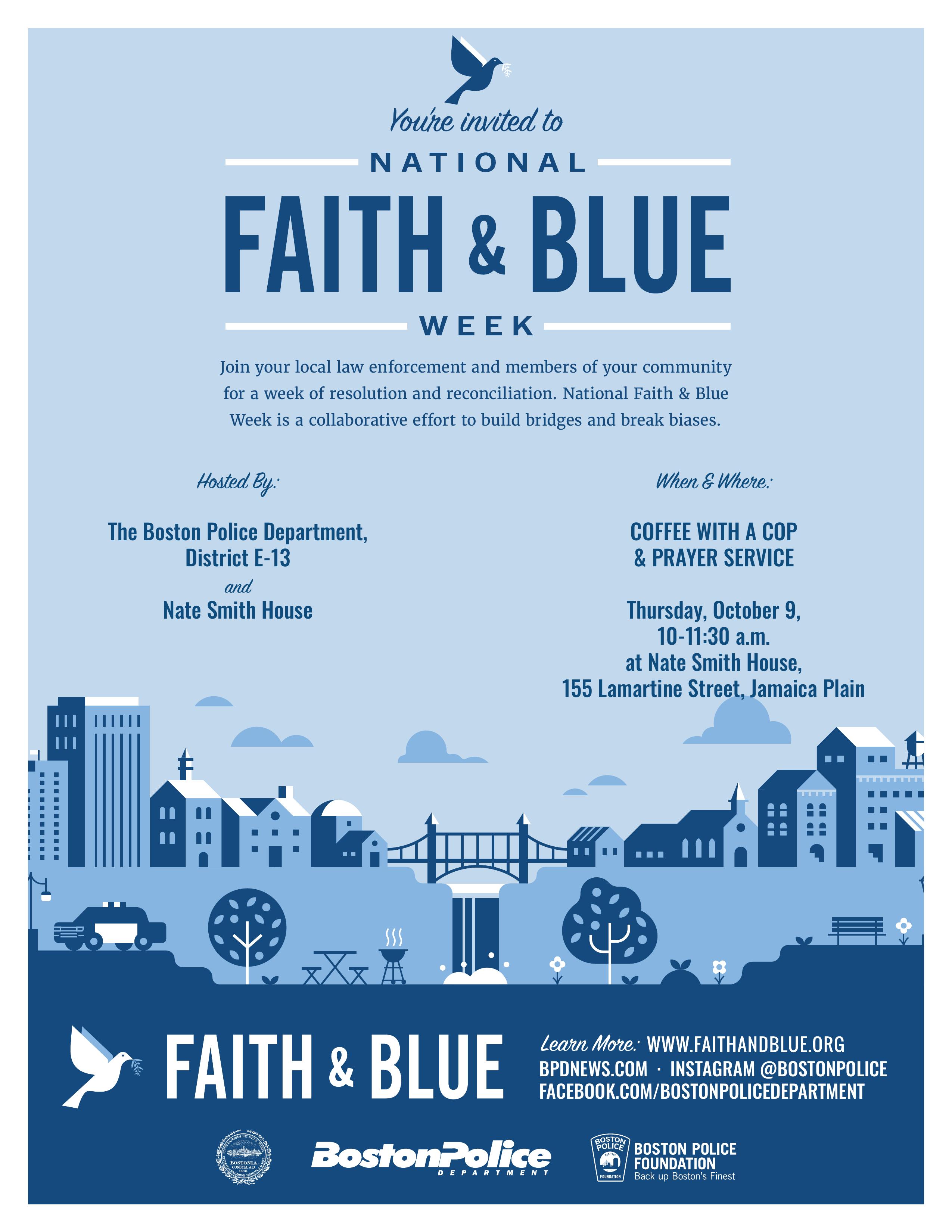 Join District E-13 officers and Nate Smith House for *Coffee with a Cop & Prayer Service* as part of Faith & Blue Week.