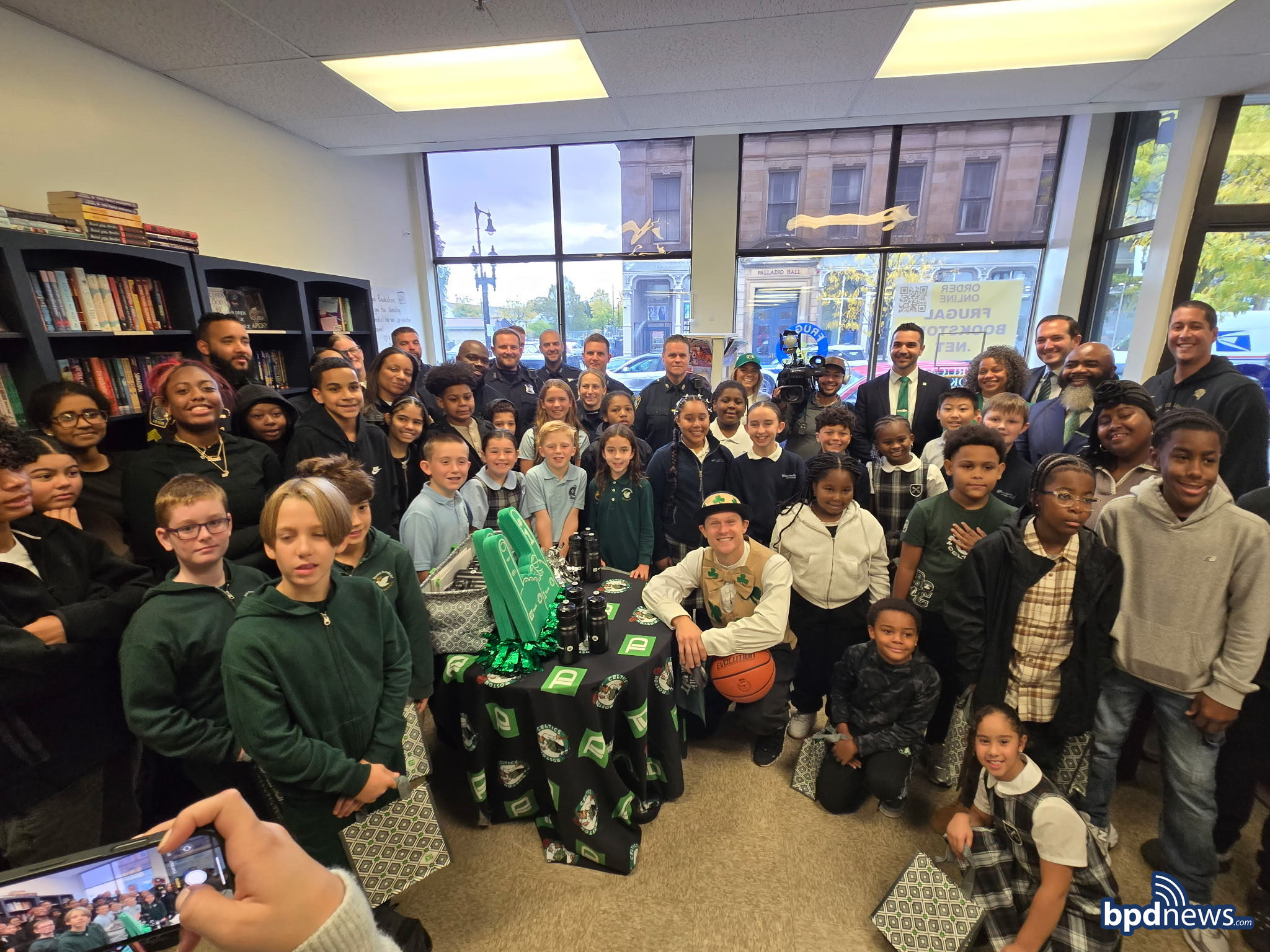 Officers from Districts B-2, B-3, C-6, and C-11 teamed up with TD Bank, the Boston Celtics, and the Frugal Bookstore to celebrate the start of the NBA season!