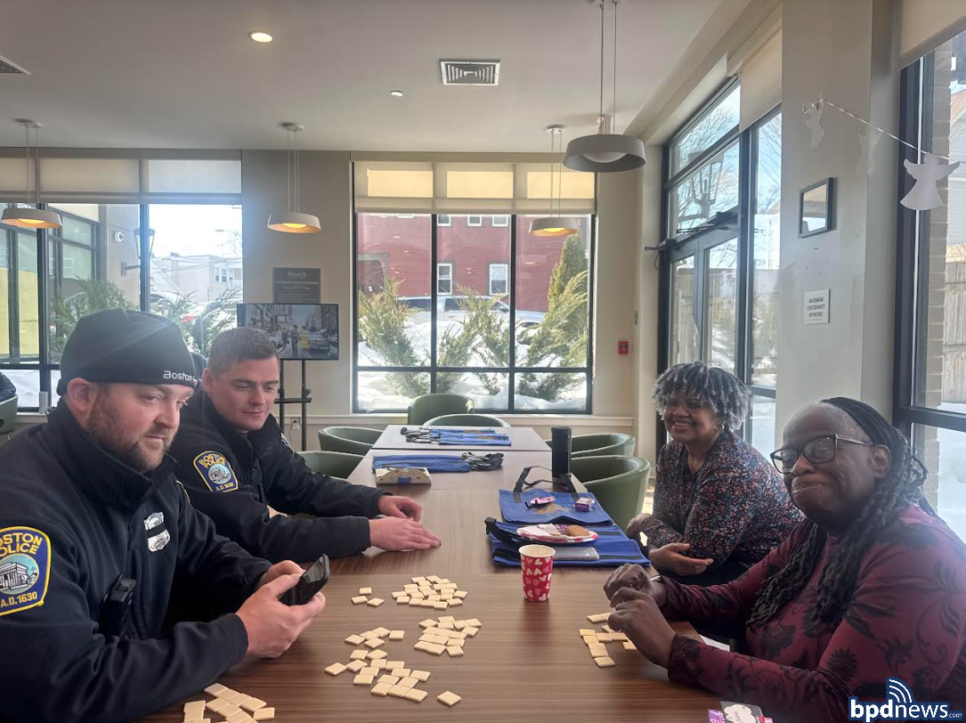 Officers from District C-11 stopped by the Hearth at Four Corners in Dorchester and spent the morning with some of the senior residents.