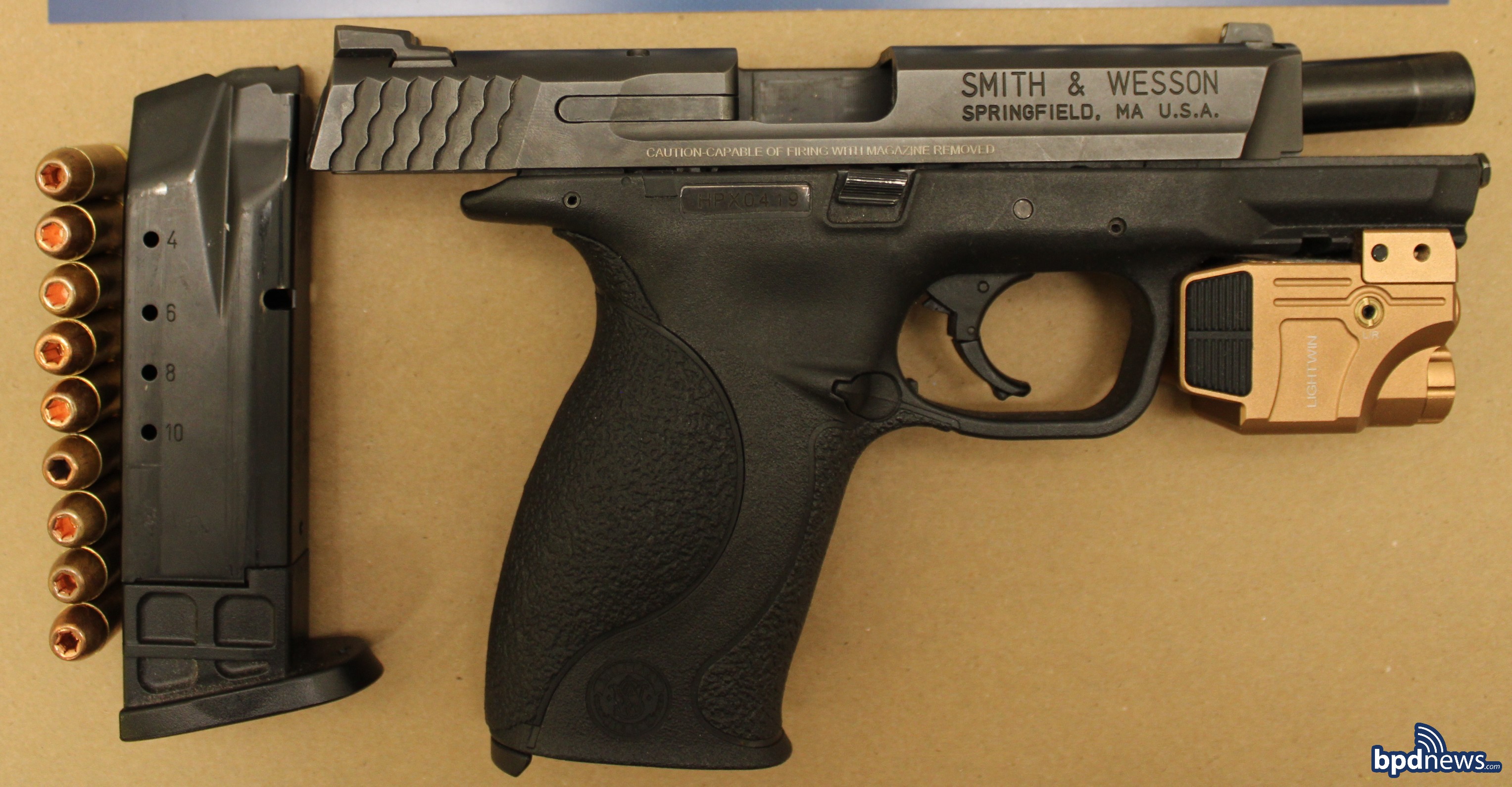 After further investigation, an exit order was made of all of the occupants. When officers conducted a pat frisk of the front passenger, they recovered a firearm from his right pant pocket. The firearm was determined to be a Smith & Wesson M&P 40 with a gold light attachment and nine rounds in the magazine.